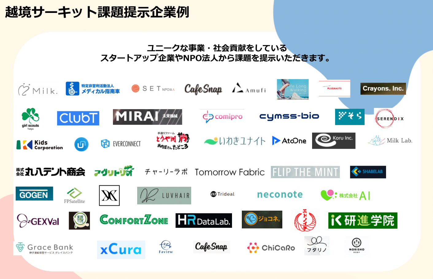 越境サーキットはユニークな事業・社会貢献を行っているスタートアップやNPO法人から課題を提示いただき進めていきます。