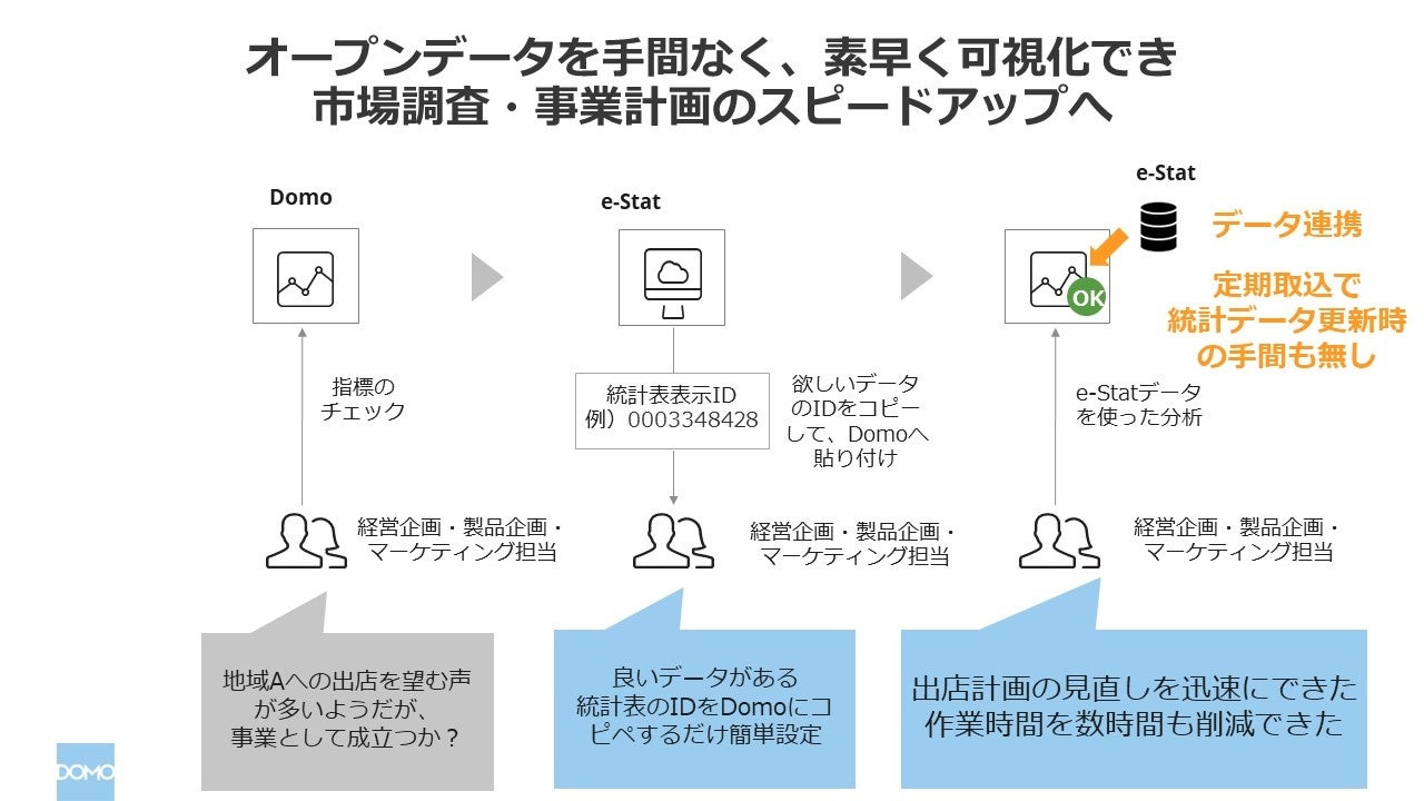 「e-Stat」には、国勢調査データ等の約20万件のオープンデータがあります。特に自社ビジネスの変化の要因を分析できる「生活スタイルの変化」に関する情報や、事業のターゲット層を推計して事業シミュレーションに活用できる「人口・世帯・企業数」の情報は、経営企画・製品企画・マーケティング担当者が市場調査や新規事業、新製品・新サービス開発において、貴重なリソースとなります。Domoの「e-Stat」と連携が可能なコネクターによって有益なオープンデータがより活用しやすくなり、常に最新の統計データに自動更新され、さらに、自社データと組み合わせて利活用ができるため、市場調査や事業計画を深化させることができます。