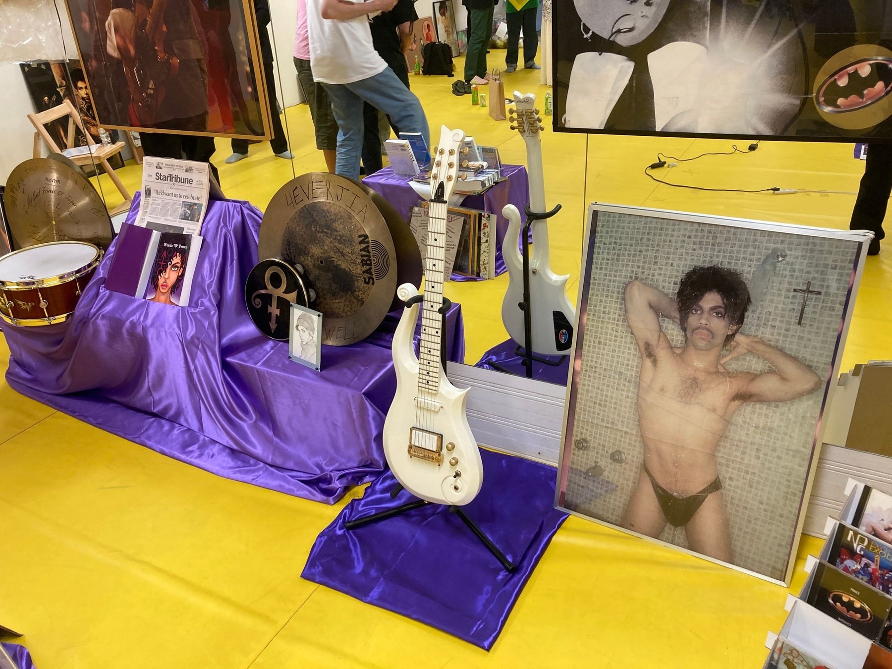 会場は二重作拓也氏が親交のあった、NPGのドラマージョンブラックウェル氏のシンバル、スネアドラムを筆頭に、レコード、CD、カレンダー、書籍、スクラップ記事、ギターなどここでしか見ることのできない貴重なプリンスゆかりの品々で埋め尽くされていた。