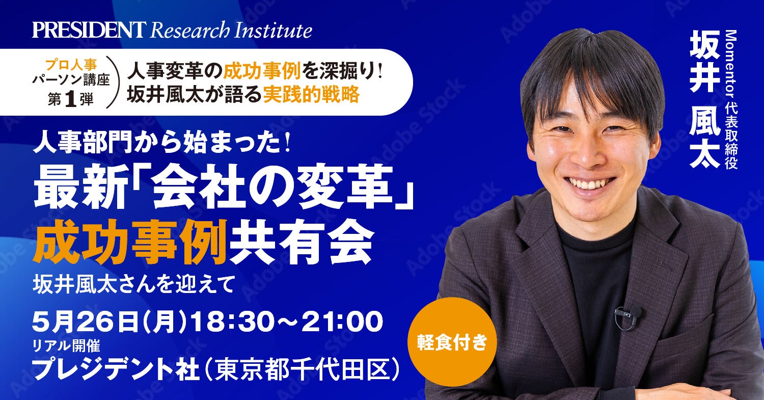 株式会社プレジデント社(本社:東京都千代田区、代表取締役社長:鈴木勝彦)は、プロ人事パーソン講座の第一弾として、「人事部門から始まった!最新『会社の変革』成功事例共有会」を5月26日に開催いたします。