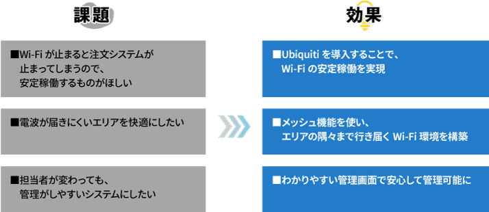 加えて「Ubiquiti UniFiシリーズ」はメッシュ機能に対応しているので、レストランやショップなどの店舗のように工事ができる時間が限られている場所でも、LANケーブルの配線なしで無線エリアを拡張ができます。実際に電波が届きにくかった場所へ増設し、店舗の隅々まで行き届くWi-Fi環境を構築しました。