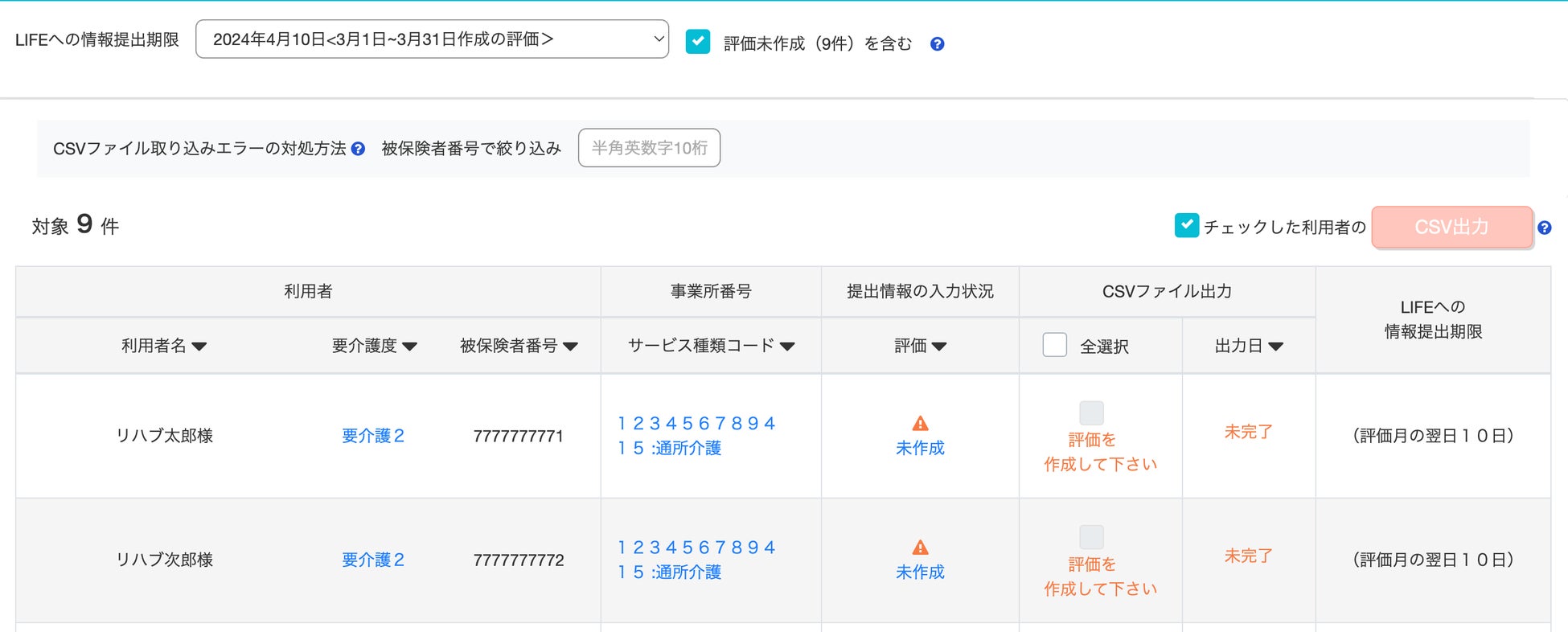 LIFEへ情報提出漏れがあると加算の算定ができないため、「Rehab Cloud リハプラン」では利用者一人ひとりの提出時期をかんたんに管理できる機能があります。