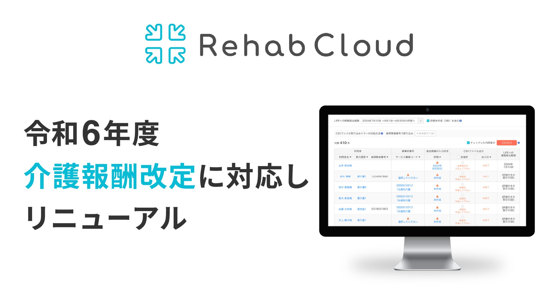 株式会社Rehab for JAPAN(本社:東京都千代田区、代表取締役:大久保 亮 以下「当社」)は、2024年4月1日に、「Rehab Cloud」において2024年度4月の報酬改定に対応してリニューアルいたします。