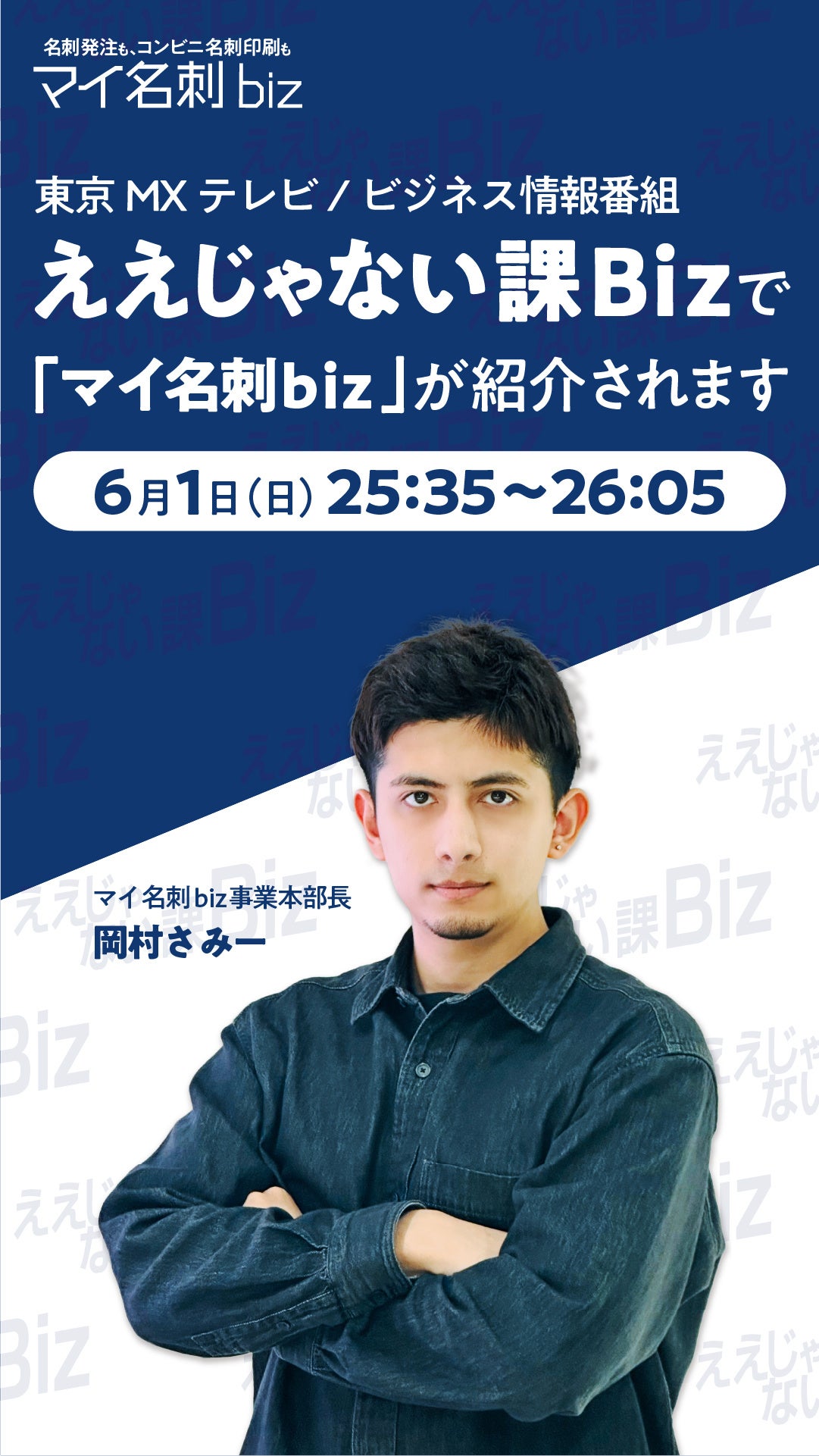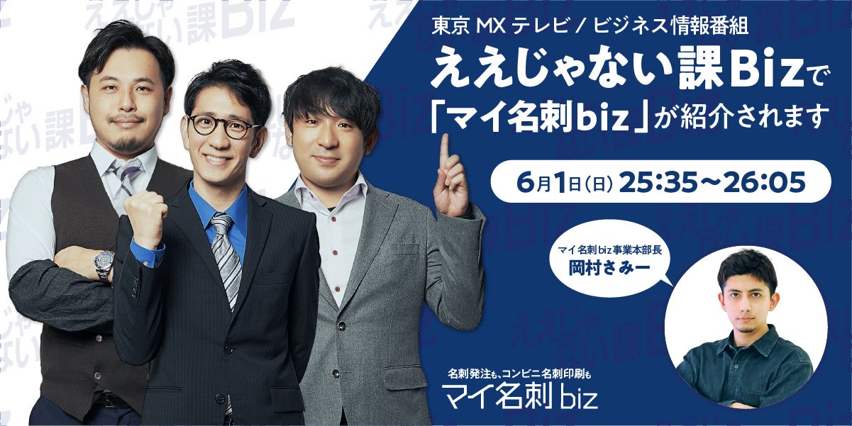 株式会社サムライソード(本社:東京都豊島区)が提供する、Web完結型の名刺発注サービス『マイ名刺 biz』が、東京MXテレビのビジネス情報番組「ええじゃない課Biz」にて紹介されます。放送日時は、2025年6月1日(日)25:35〜26:05(※6月2日 1:35〜2:05)です。