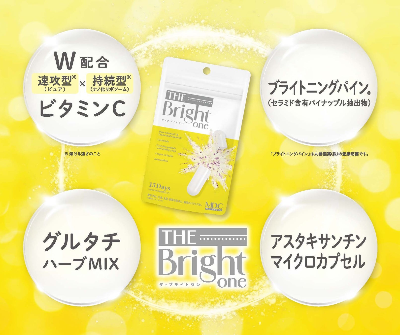 「ザ・ブライトワン」は、話題の美容成分を配合した独自のザ・ブライトワンフォーミュラが、あらゆる方面から内側からの美しさをサポート。速攻型※1の「ピュアビタミンC」、持続型※1の「リポソーム型ビタミンC」、パイナップル生まれの食べる美容成分「ブライトニングパイン®※2(セラミド含有パイナップル抽出物)」、内側からの美しさをサポートするトルラ酵母と4種のハーブをミックスした「グルタチハーブMIX」、赤い美容オイル「アスタキサンチン」を輝く白玉カプセルに独自配合。内側から美容の土台を整えたい、ビタミンCをしっかり摂りたいなどと考えていらっしゃる方に、お勧めしたいサプリメントです。1日2粒のインナーケア、毎日の美容習慣にぜひ取り入れてみてください。