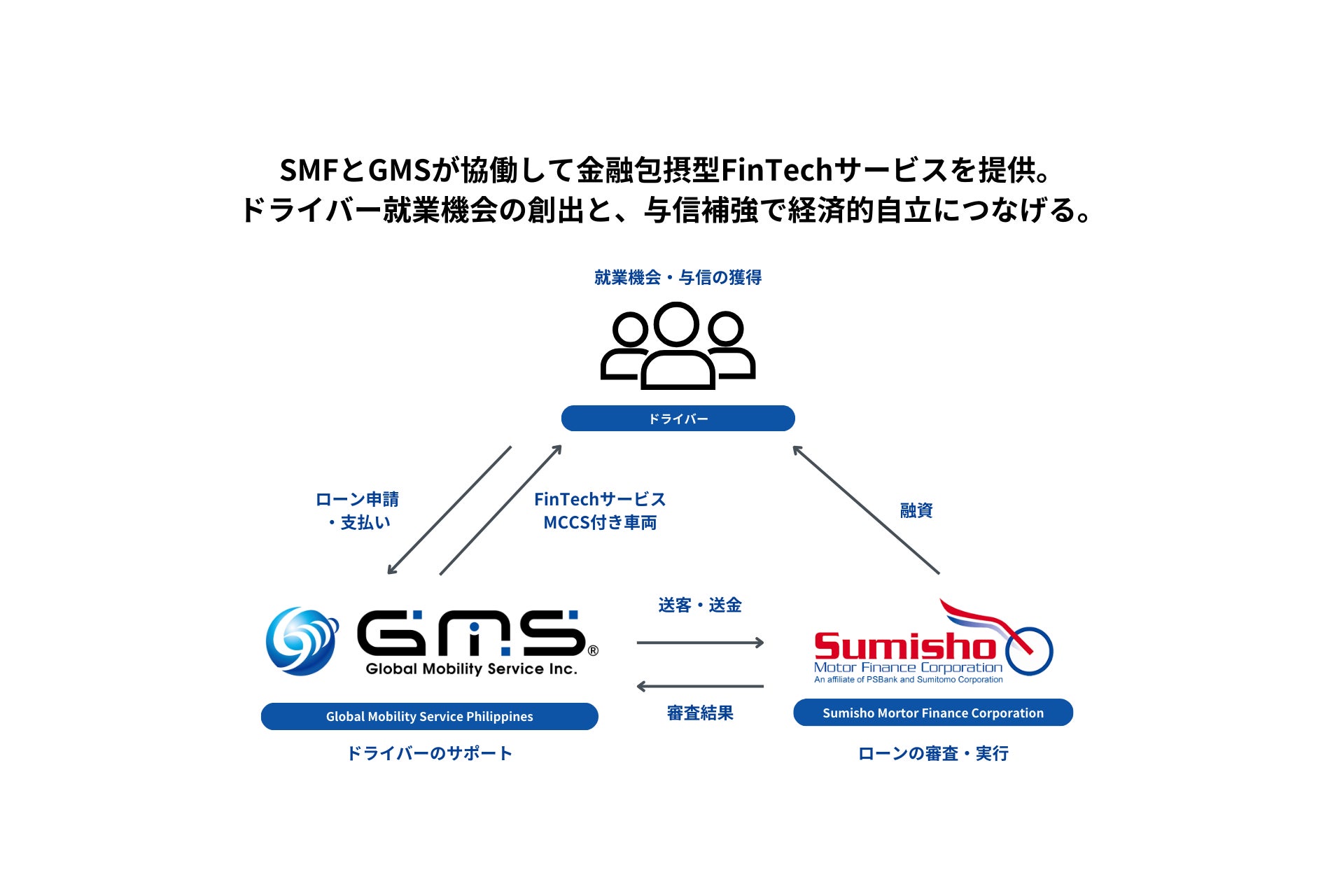 GMSのFinTechサービスを活用し、車両を安全に遠隔起動制御するIoT デバイス「MCCS」を搭載した車両を対象としたローンを提供します。GMSが車両を調達したい個人や組織などの窓口となりローン申請を受付け、Sumisho Motor Finance Corporationが車両購入に必要な資金の融資を行います。また、車両を提供するだけではなく、GMSの与信創造プラットフォームMSPFにて走行データやローンの支払データを活用したドライバーの信用補強を行い、現地金融機関とパートナーシップを組み、ドライバーのさらなる金融サービスの利用を促す仕組みを構築してまいります。