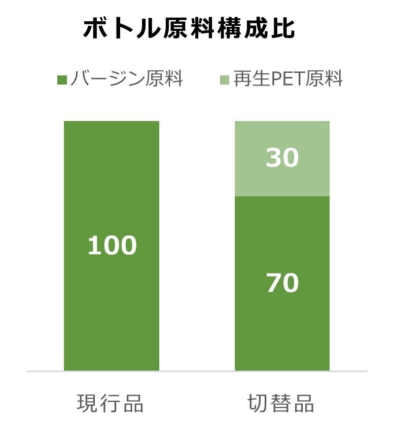 マーク周辺には「ボトルの一部に再生PET原料を使用」と具体的な取り組み内容を併記します。
