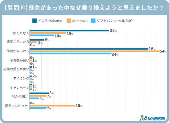 「懸念があった中なぜ乗り換えようと思えましたか?」という質問の回答は、どの大手から乗り換えた人も「値段が安いから」が1位でした。