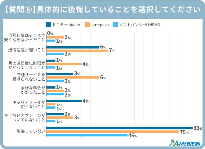 特に、ソフトバンク→LINEMOでは64.3%、au→povoでは56.0%が「特になし」と回答。