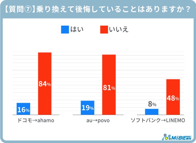 「乗り換えて後悔していることはありますか?」という質問には、どの大手から乗り換えた人も「いいえ」という回答が多くなりました。