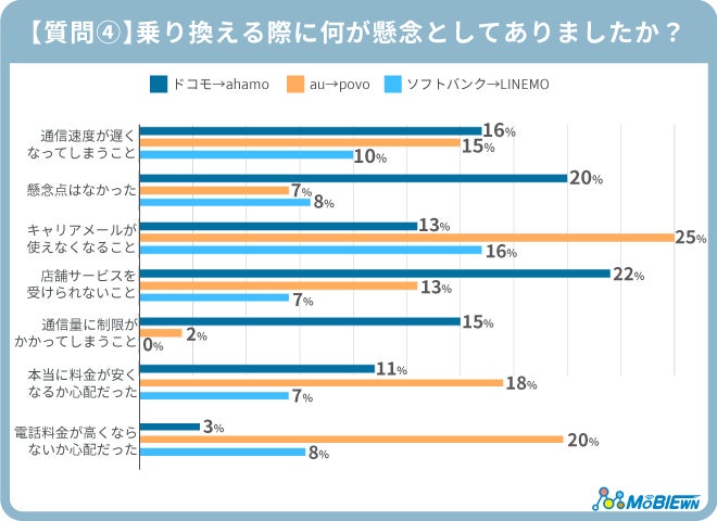 「乗り換える際に何が懸念としてありましたか?」という質問では、「キャリアメールが使えなくなること」が多めですが、回答にばらつきがありました。