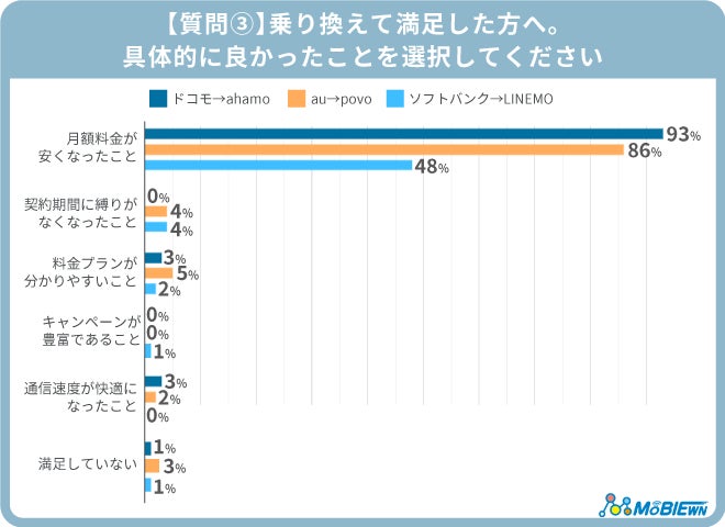 「乗り換えて満足した方へ。具体的に良かったことを選択してください」という項目では、「月額料金が安くなったこと」が1位でした。