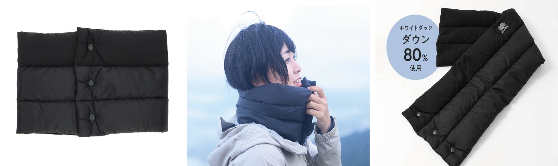 良質なホワイトダウンを採用し、軽量ながら高い保湿性を実現。表生地には撥水加工、肌にあたる部分には柔らかな起毛素材を使用しています。
