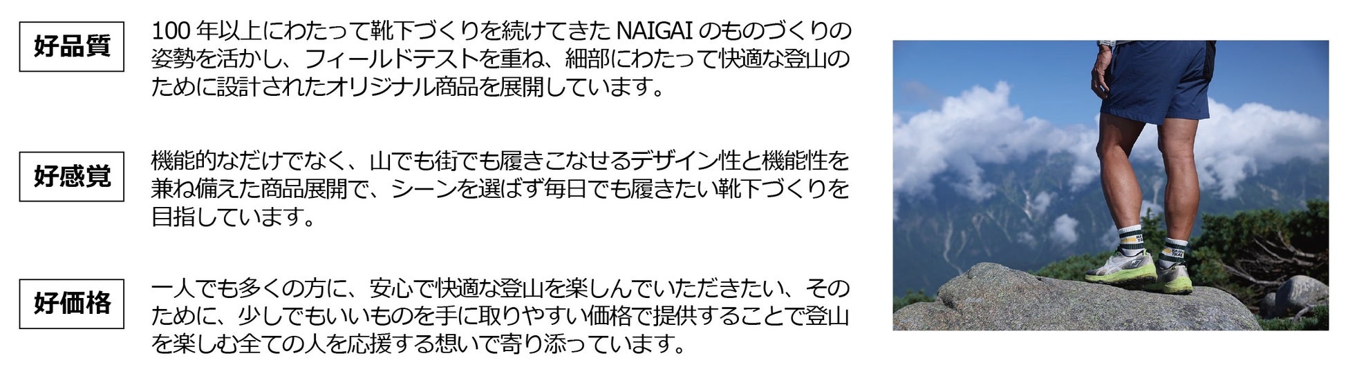 NAIGAI TRAILのアイテムは、山を愛するスタッフ自身の足で歩いた経験から生まれました。靴下、帽子、タオル、ネックウォーマーなどひとつひとつのアイテムが現場の実感をもとに考えられ作られています。