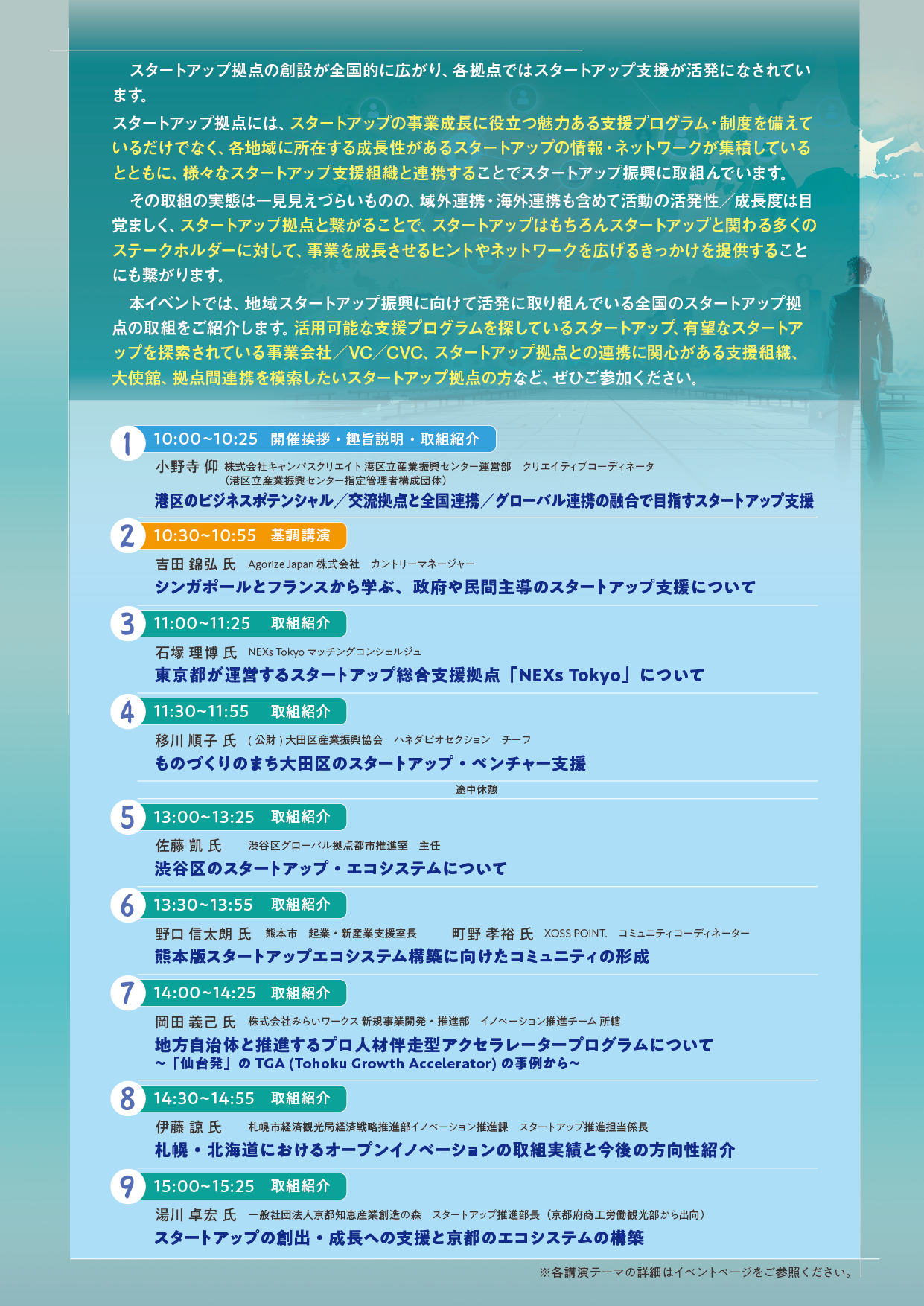 本イベントでは、地域スタートアップ振興に向けて活発に取り組んでいる全国のスタートアップ拠点の取組をご紹介します。活用可能な支援プログラムを探しているスタートアップ、有望なスタートアップを探索されている事業会社/VC/CVC、スタートアップ拠点との連携に関心がある支援組織、大使館、拠点間連携を模索したいスタートアップ拠点の方など、ぜひご参加ください。