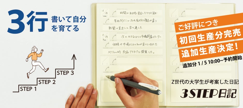 【完売御礼】Z世代が考案した1日3行書くだけで自分を育てる「3STEP日記」正式販売日前に初回生産分完売。追加生産分予約を1月5日10時より開始