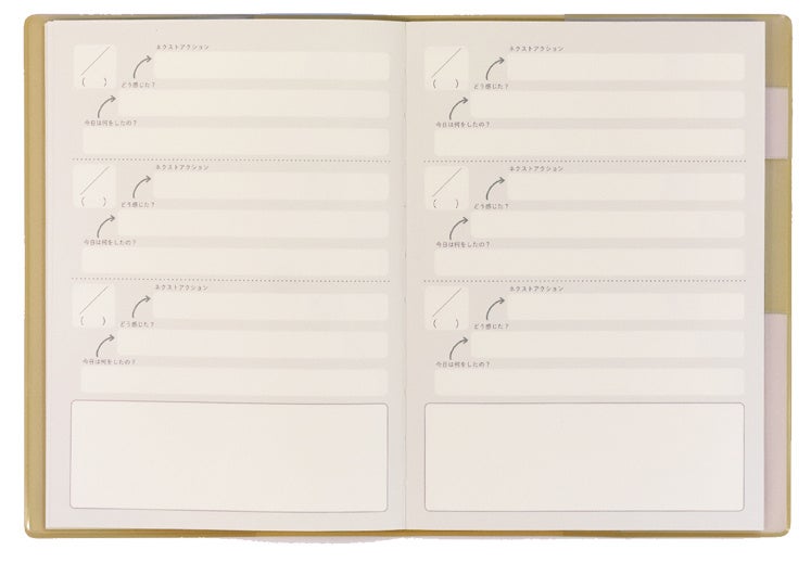 3STEP日記の特長は今日の出来事・気づき・次への行動を3行・3段階にわけて記入する形式です。日付を自分で書き込む日付フリー形式を採用した事により、いつからでも始める事ができる、書けなかった日が空白にならず自分のペースに合わせて無理なく続ける事が可能です。