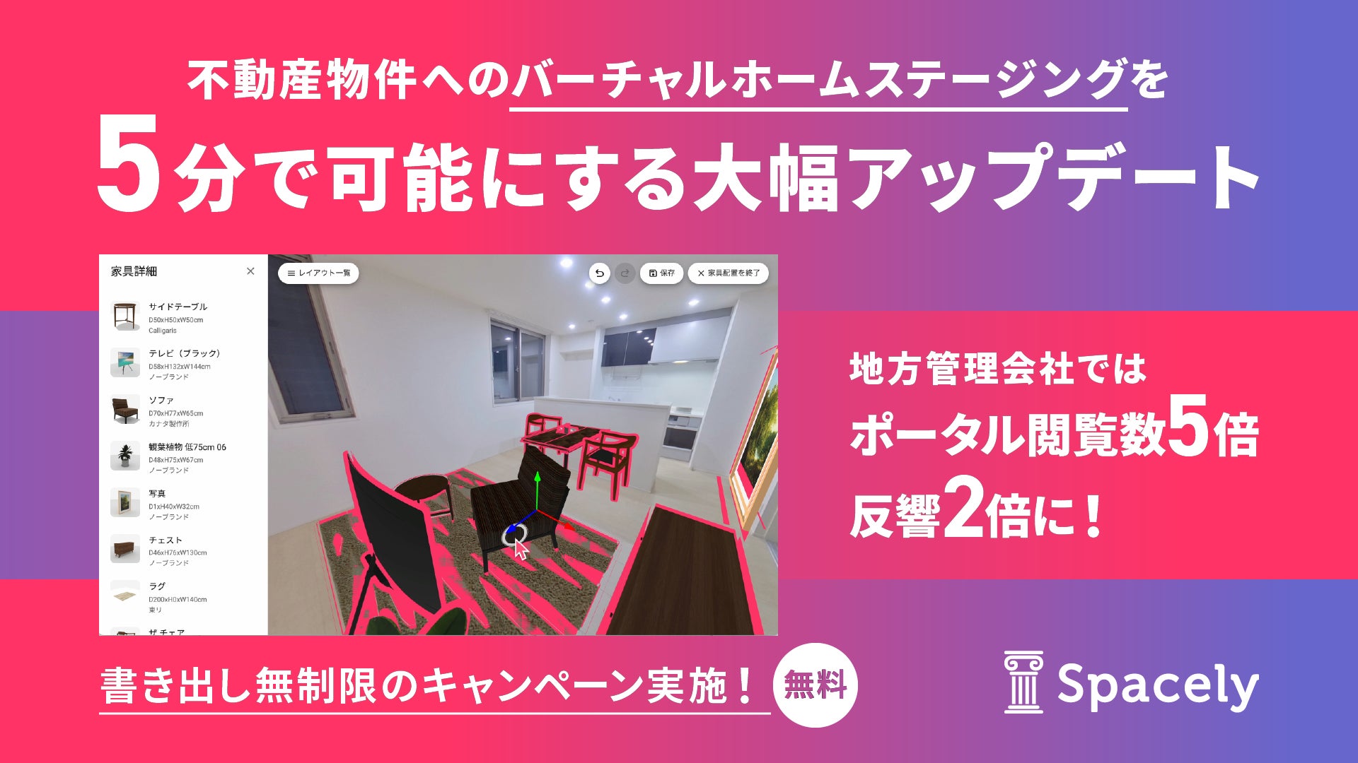 Spacely(スペースリー)不動産物件へのバーチャルホームステージングを5分で可能にする大幅アップデート、10月末まで利用無制限のキャンペーンを実施