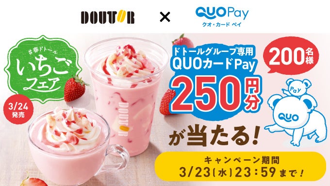 ドトールコーヒー×QUOカードPay QUOカードPay250円分が200名様に当たる 「ドトールでいちご満喫」キャンペーンを開催!