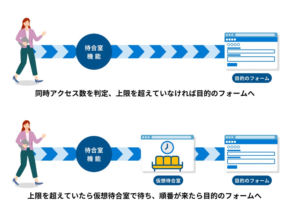 フォームへのアクセス数を判定し、上限を超えた場合は自動で仮想待合室へ案内します。混雑状況と待ち時間の目安を表示し、順番が来たら自動的に目的のページに案内します。