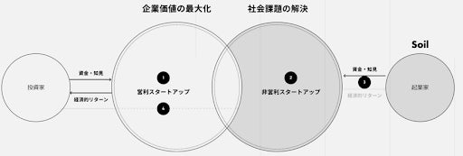 Soilは、非営利スタートアップに圧倒的に不足している創業期の資金を助成し、また成長のための支援をする財団です。「儲からない」けど、「意義がある」 事業に取り組むチームを、あえて現時点では一般的でない「非営利スタートアップ」という言葉で定義しています。