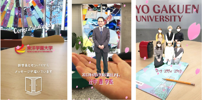 映像は「Welcome to TOYO GAKUEN UNIVERSITY!」「合格おめでとうございます。4月にお会いしましょう」「受験勉強お疲れさまでした」「東洋学園大学で一緒に楽しい生活を送りましょう」などのメッセージで合格者を祝い労う内容となっています。