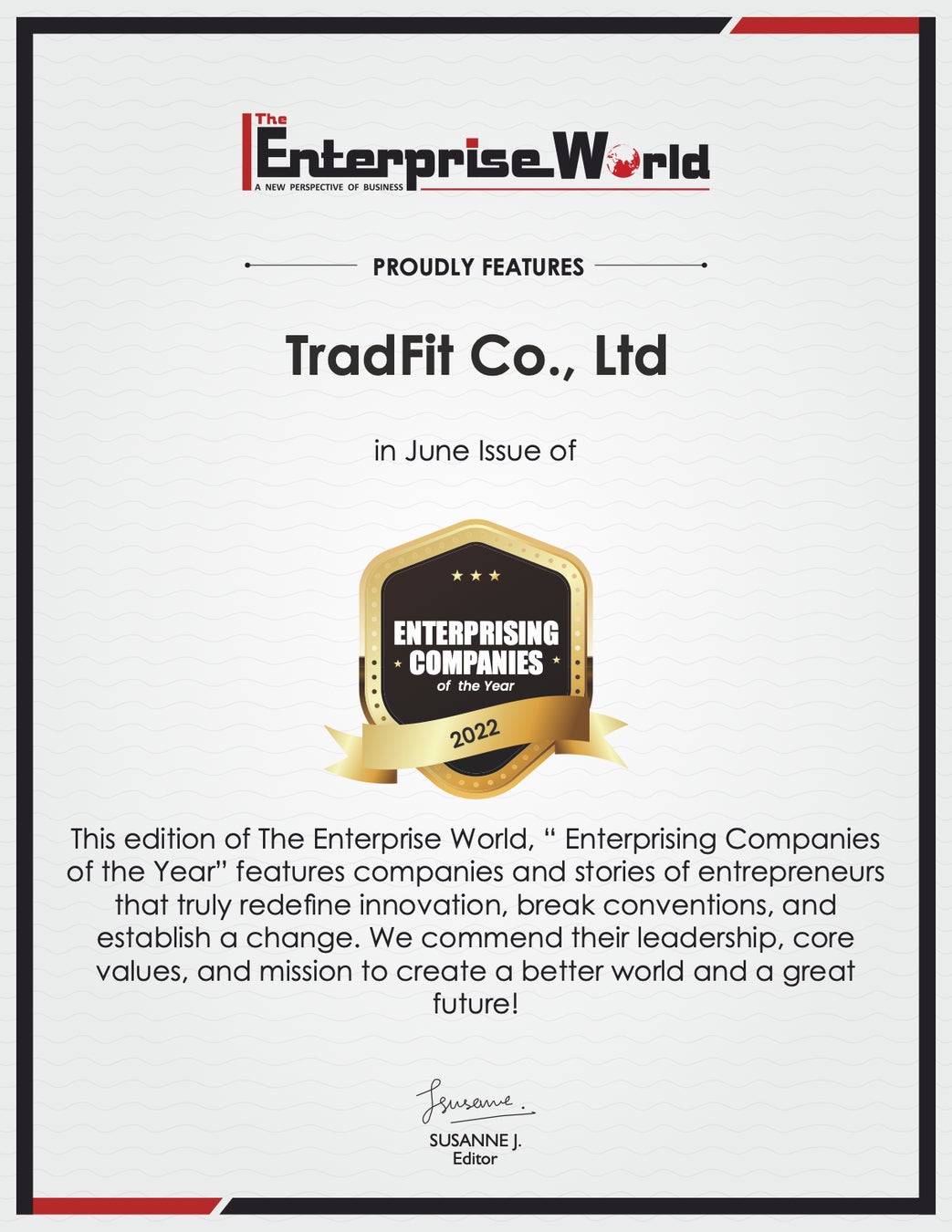 TradFitは著名USメディアのThe Enterprise Worldより、Enterprising Companies of the Yearへ選出・認定証受賞