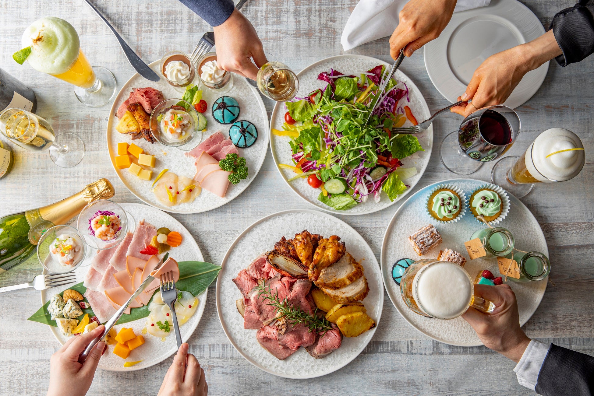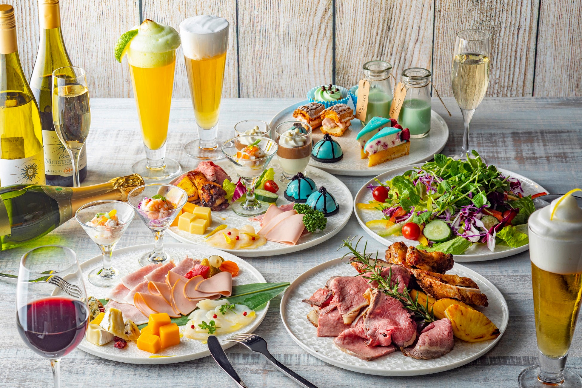 前菜、サラダ、シーフードや各種カーヴィング、更にチーズや自家製パン、デザートまで90種類以上のアイテムが揃うディナービュッフェからはお好きな物をお好きなだけ1ラウンド限定でお楽しみいただけます。1プレートにシュラスコビーフやバーベキューポークベリーのカービングをたっぷり盛り上げたり、シャルキュトリーやパテ・ド・カンパーニュ、様々なチーズを盛り合わせたワインにぴったりのプレートをアレンジしたり、スイーツ好きには「アリスのペパーミント気分のお茶会」より10種類ものスイーツを盛り付けたりと、楽しみ方は無限です。