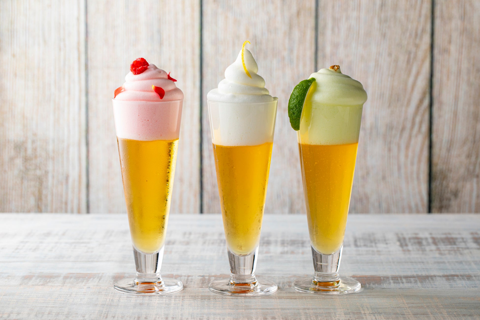 アサヒスーパードライにはレモンの皮、シナモン、クローブ、生姜などを漬け込んだシロップで作るエスプーマがおすすめ。スーパードライのキレのある味に、爽やかなレモンとほのかなスパイスの風味が絶妙です。TOKYO隅田川ペールエールにはベリー系のエスプーマにバラの香りを合わせることで、上品な味わいのピンク色のフォームが出来上がります。ペールエールの優しい苦みにベリーの酸味が驚くほど合い、この1杯で新しい味蕾の発見をお楽しみいただけます。そのほかにも柚子とミントのフォームはペローニのすっきりとした味わいに合わせる事により、柚子のほのかな苦みが際立ちます。