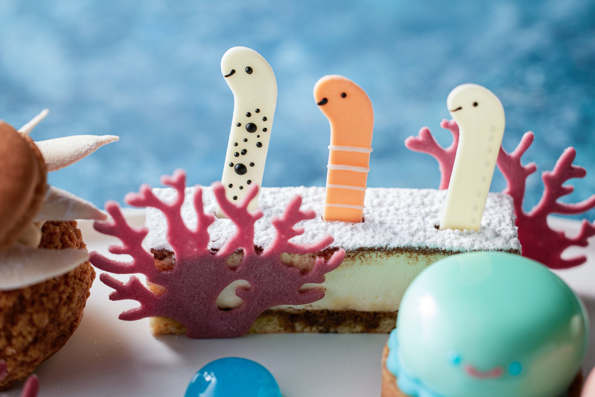北海道産マスカルポーネを使用した濃厚なティラミスを、水槽をイメージして長方形に仕立てました。チンアナゴ、ニシキアナゴ、ホワイトスポッテッドガーデンイールをかたどったチョコレートで、すみだ水族館の世界観をユニークに演出しています。