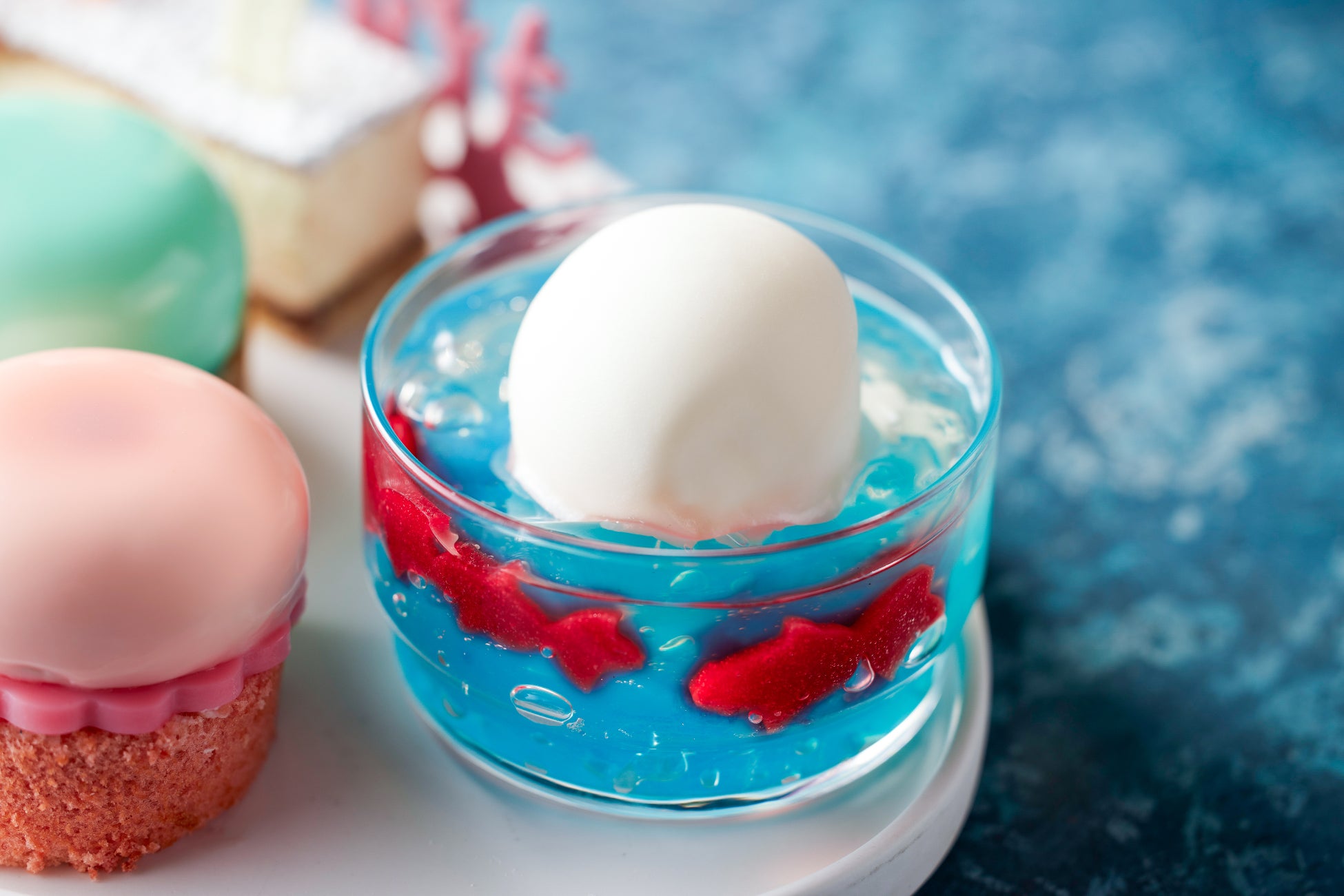 青く透き通るエルダーフラワーゼリーに白いライチソルベを浮かべ、ラズベリーの寒天で泳ぐ金魚を表現しました。涼感たっぷりで遊び心あふれる一品です。