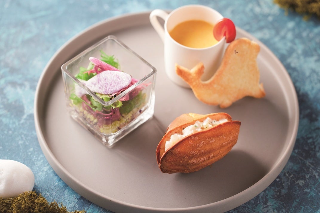 小笠原の塩をきかせたマドレーヌに、塩漬けレモンとホタテ貝のタルタルをサンド。オットセイ型のサブレとメルバトースト、さらに海の恵みを活かしたサラダ仕立ての一品など、島の美しい自然と水の風景を一皿に表したセイボリーです。