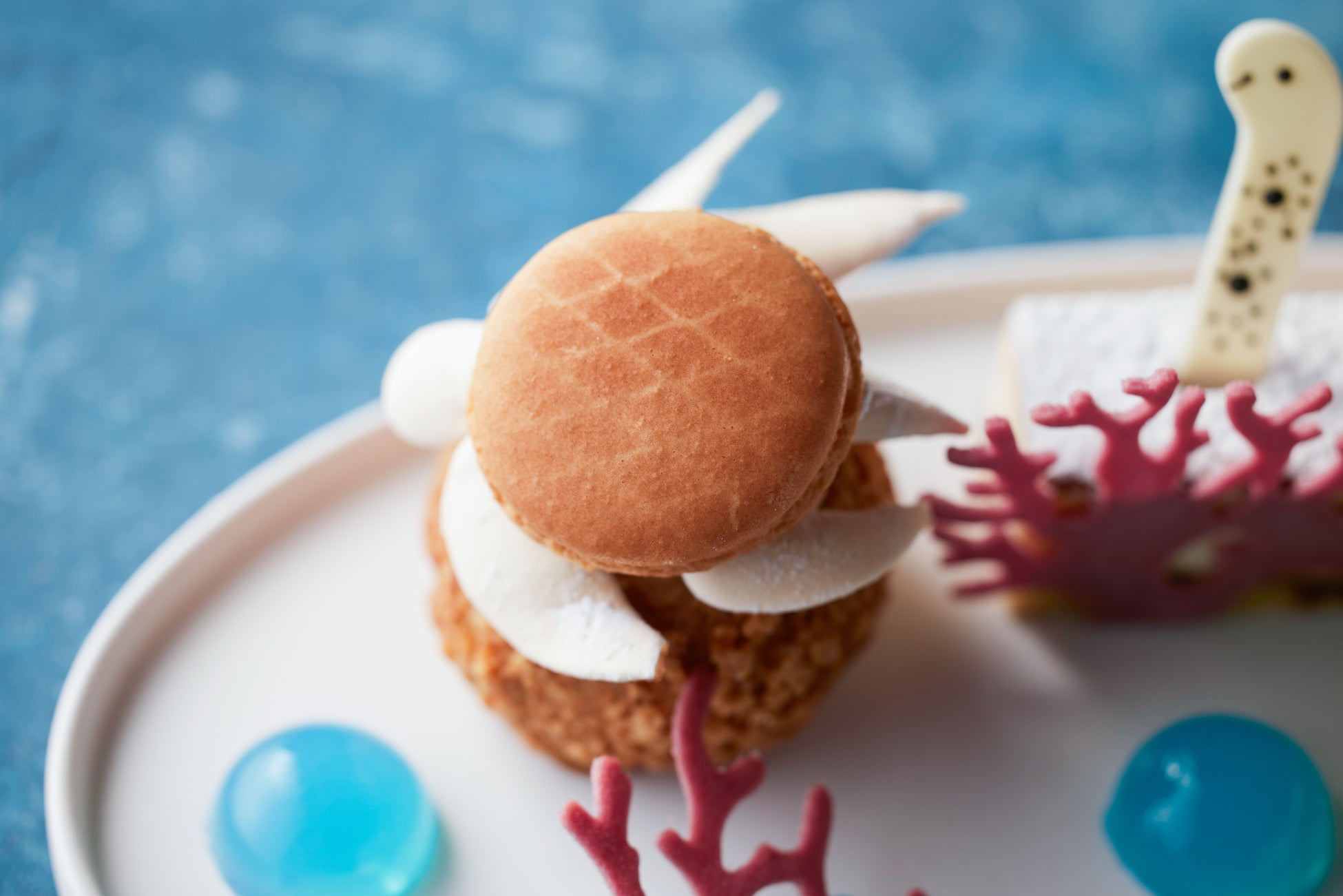プレートには、青いエルダーフラワー風味のゼリーに、ラズベリー味のチュイルでかたどったサンゴを添え、まるで海中を覗き込んだような涼やかな世界を演出しました。