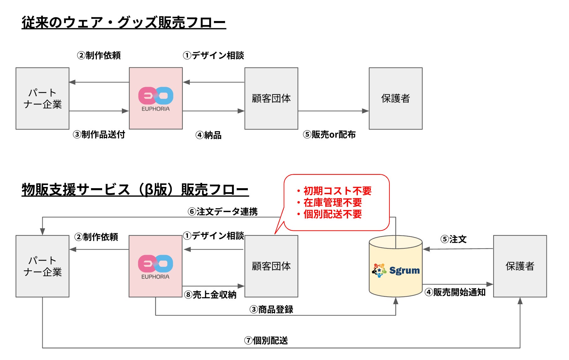 そこで今回、Sgrumの既存機能である「物販機能」(※決済も可能なスクール独自のECサイトが作成できます)を活用し、ユーフォリアが2024年8月から開始しているオリジナルウェア・グッズ制作サービスと組み合わせ、会員への配送までを含めたサプライチェーンを構築、導入いただくことになりました。エルトラックは、初期コストや在庫管理、個別配送不要で、オリジナルウェア・グッズの販売が可能になります。