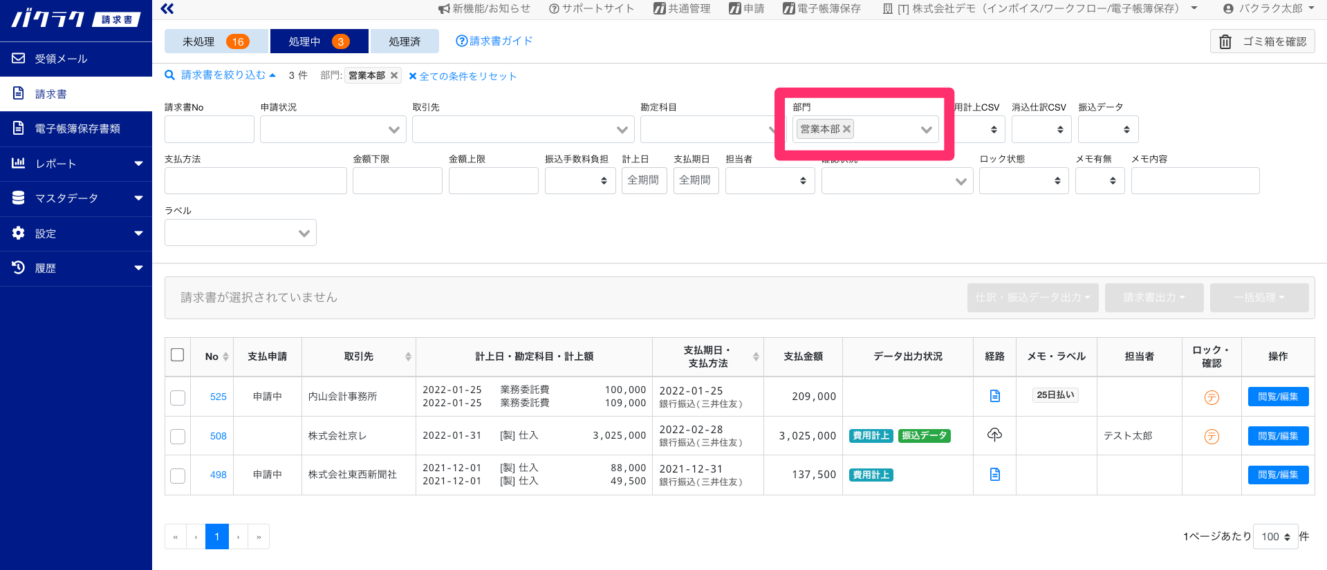 この度、新たに仕訳データの「部門」の項目で、請求書データをフィルタリングできるようになりました。