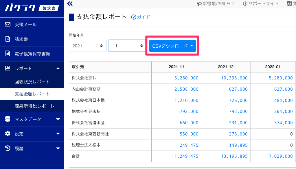 バクラク請求書で「支払金額レポート」を開くと、支払月ごとの、取引先別の支払金額を一覧表で確認いただけます。本アップデートにより、こちらのデータについて、CSV形式で出力することができるようになりました。