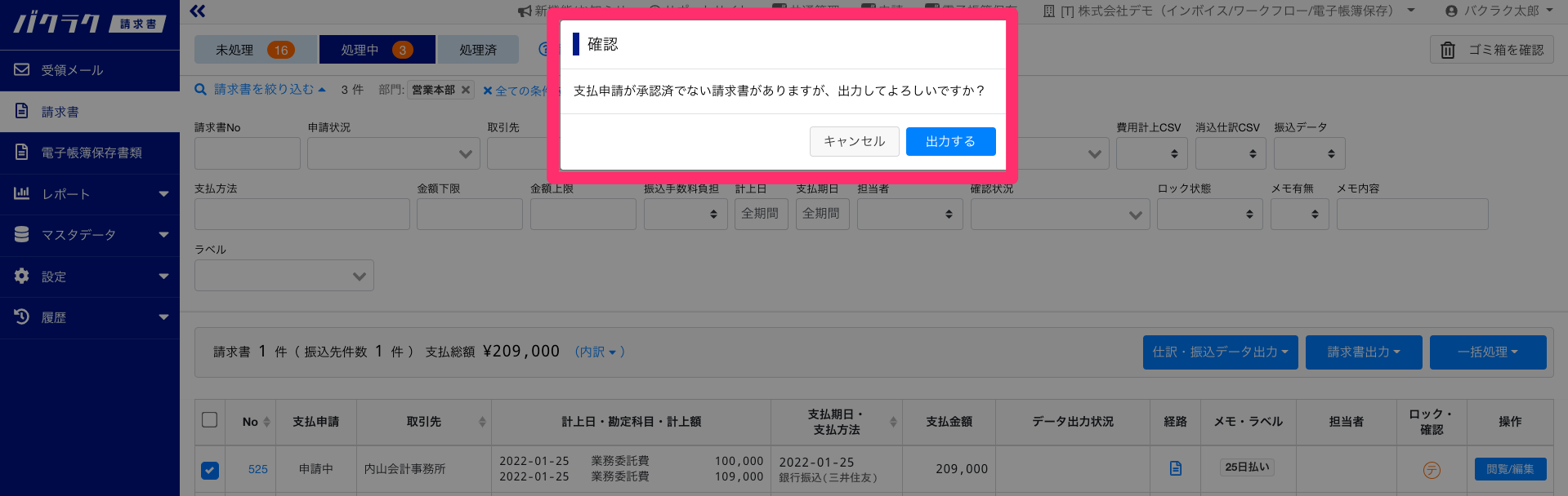 3. バクラク申請で承認が完了していない仕訳・振込データを出力する際に、確認メッセージが表示される機能