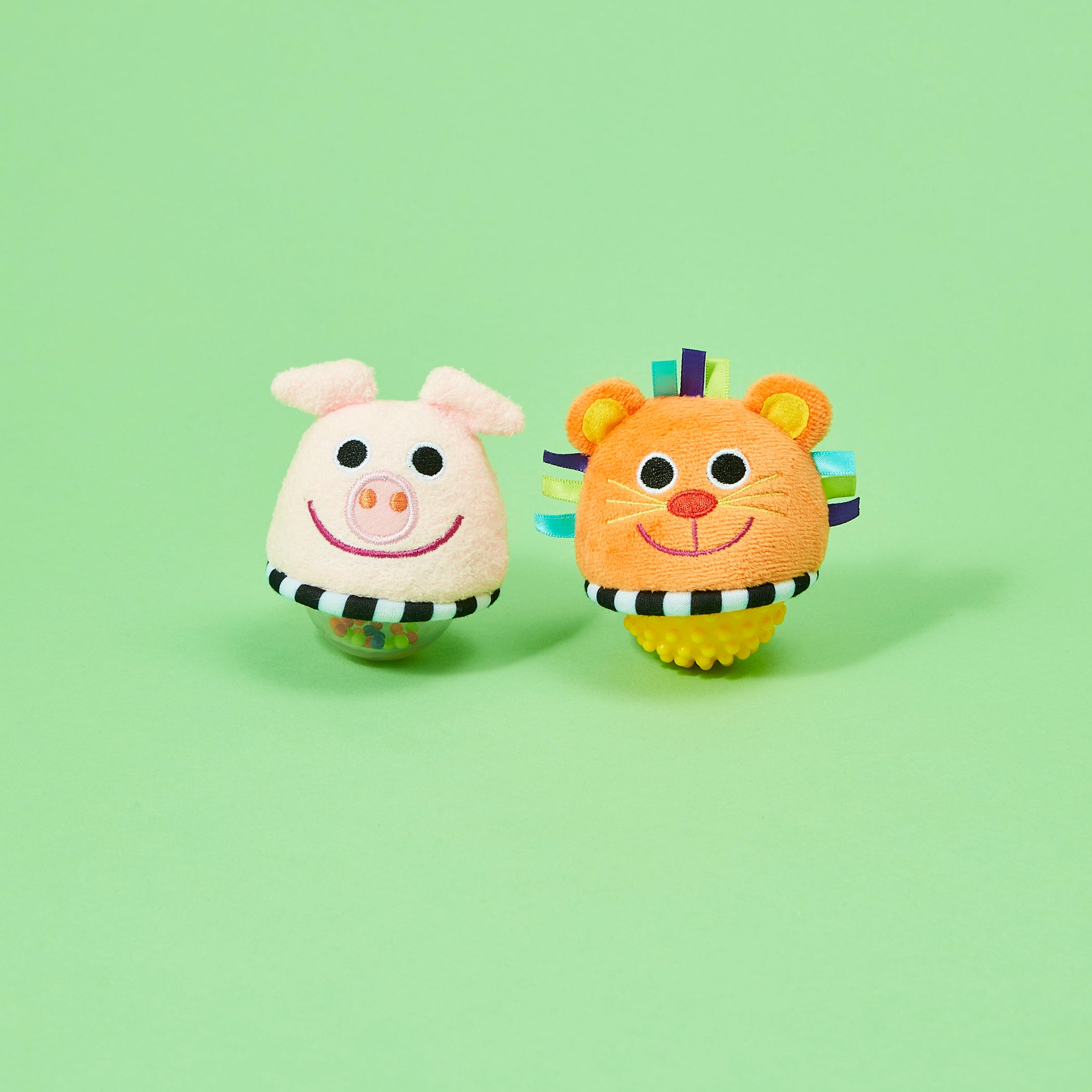 リストラトルやスタイ、タオルなど様々なアイテムのモチーフになってきたキャラクター、らいおんとこぶたがしかけがつまったラトルに。お子さまが安心感を持つ左右非対称のお顔のデザインと、カラフルな色使い、それぞれの異なるカラカラ音でお子さまの興味を引きつけます。床面のミラー、デコボコのにぎにぎ、ピラピラリボンまで、たくさんのしかけで飽きずに遊べるラトルです。