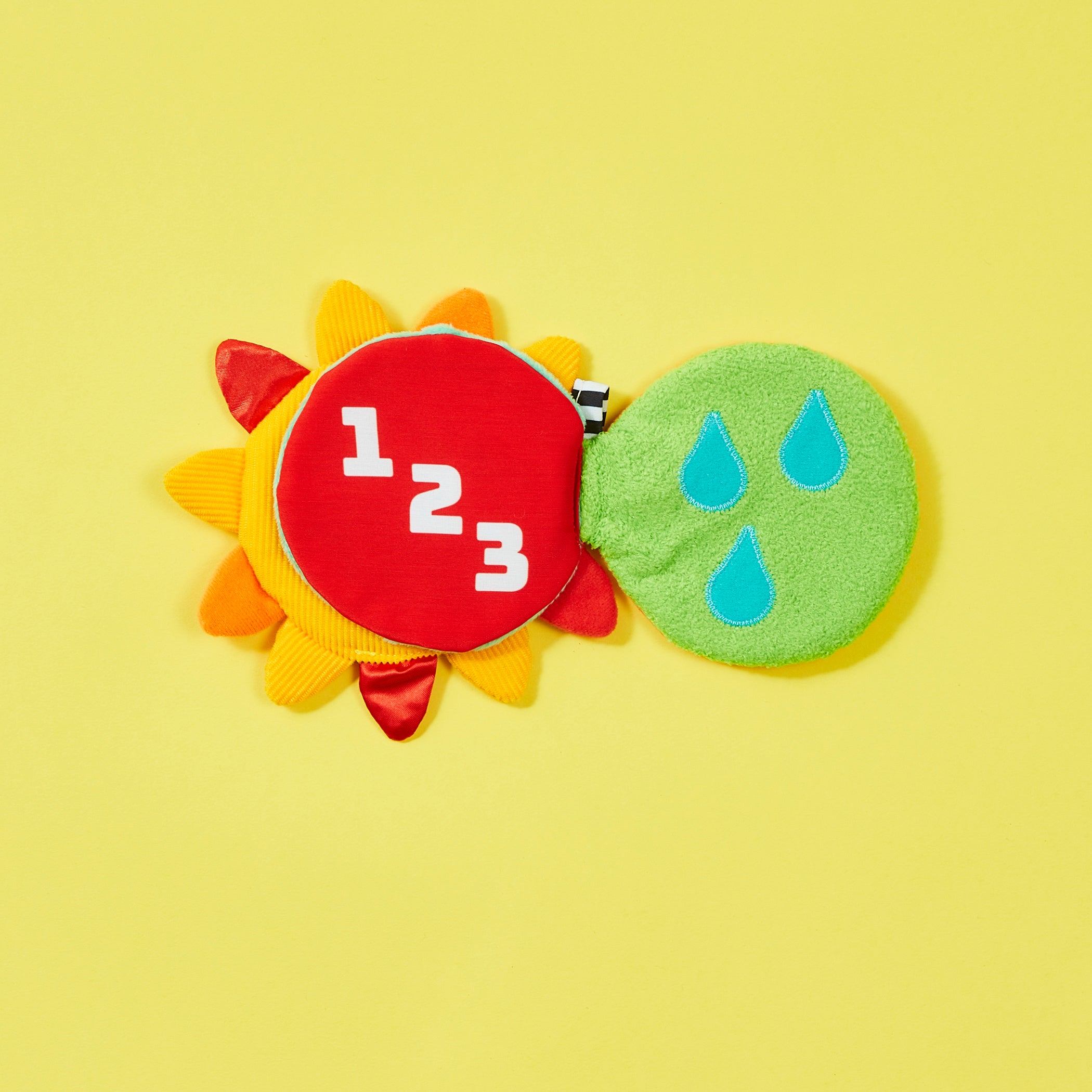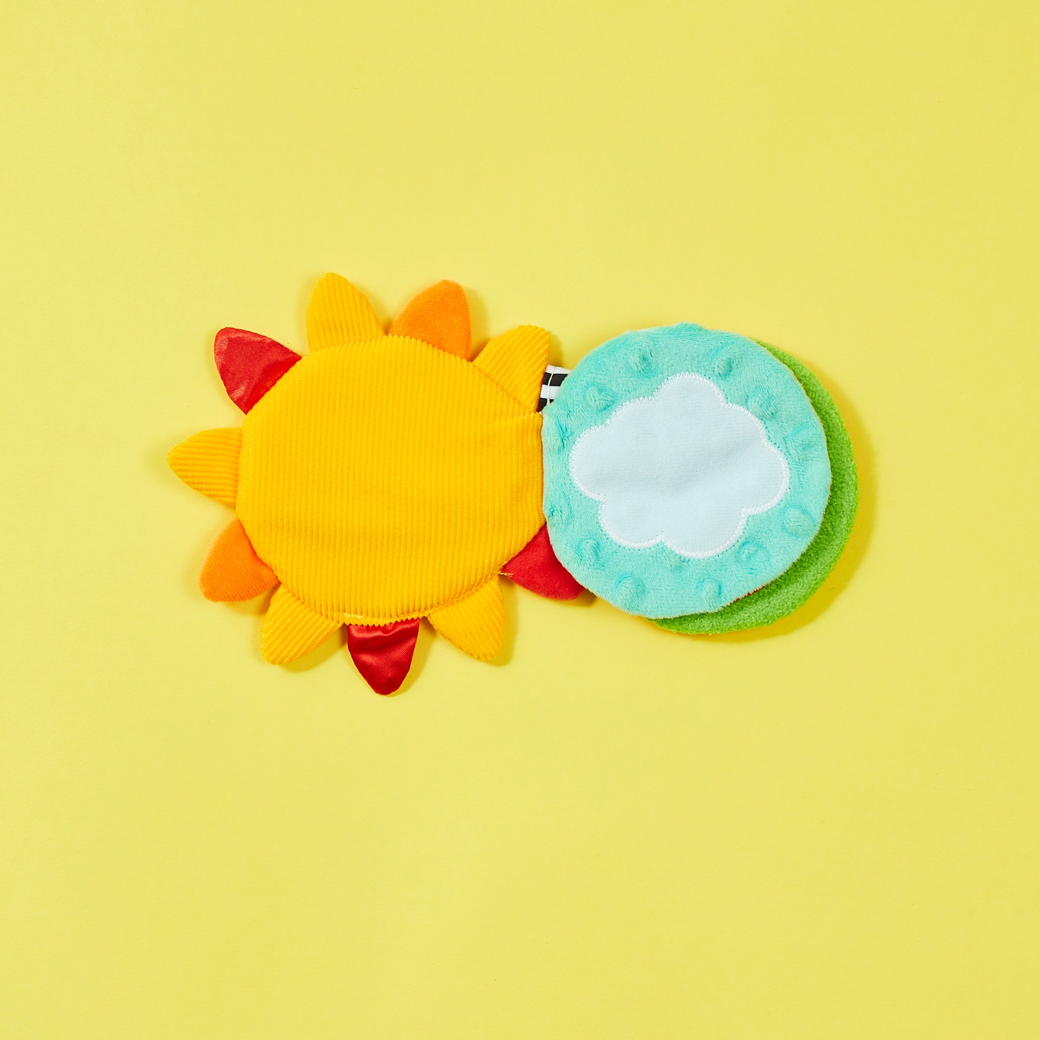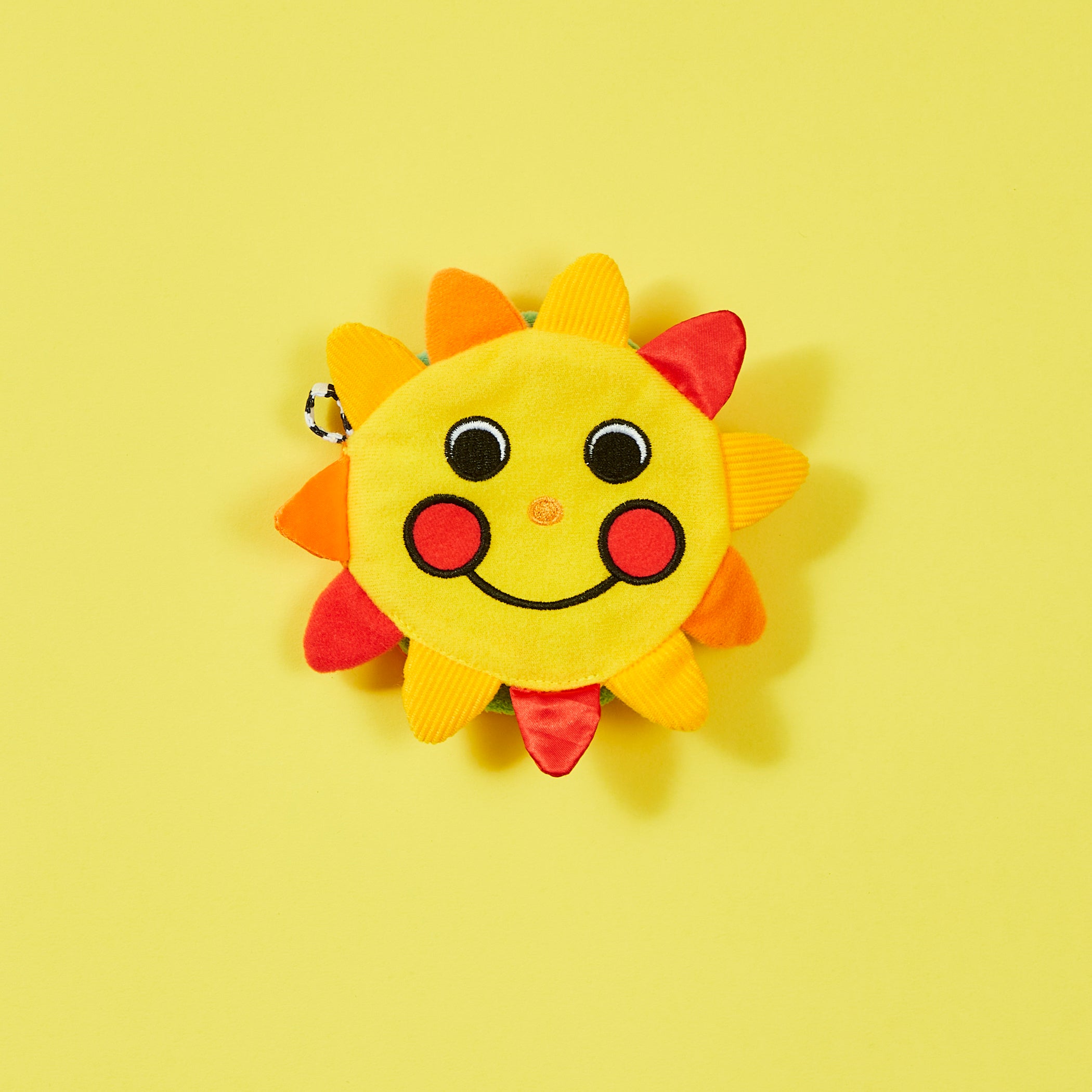 Sassyのえほんシリーズ第1弾『Sassyのあかちゃんえほん にこにこ』の表紙を飾った人気キャラクターのおひさま。お子さまが好きなかしゃかしゃ音、カラフルな色使い、ふわふわ、つるつる、デコボコなどの触感が楽しいぬのえほんになりました。雲や雨粒、数字が描かれたページで親子の会話を豊かに。直径約15㎝のコンパクトサイズで、ベビーカーなどに取り付けやすいループ付きなのでお出かけのお供にもおすすめです。