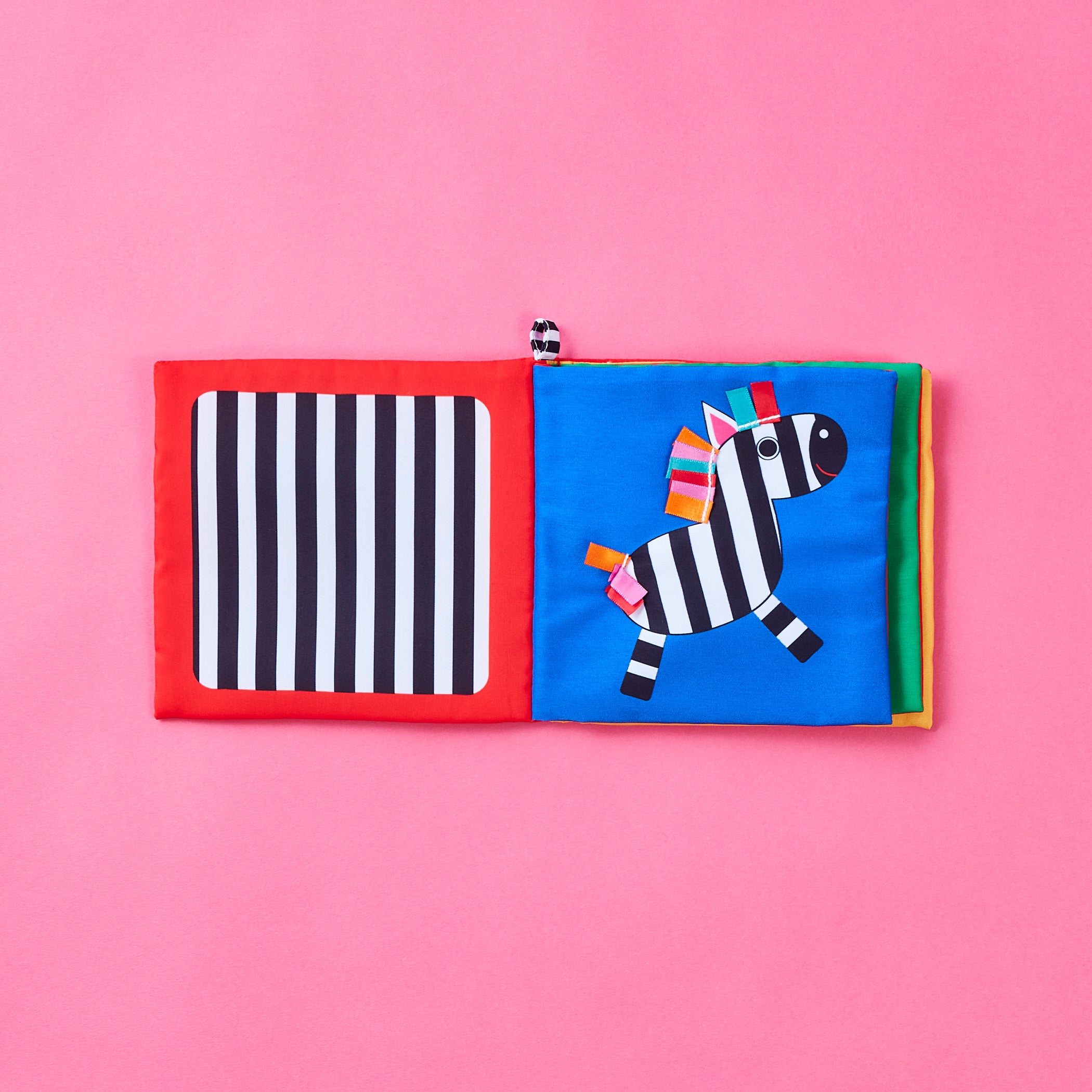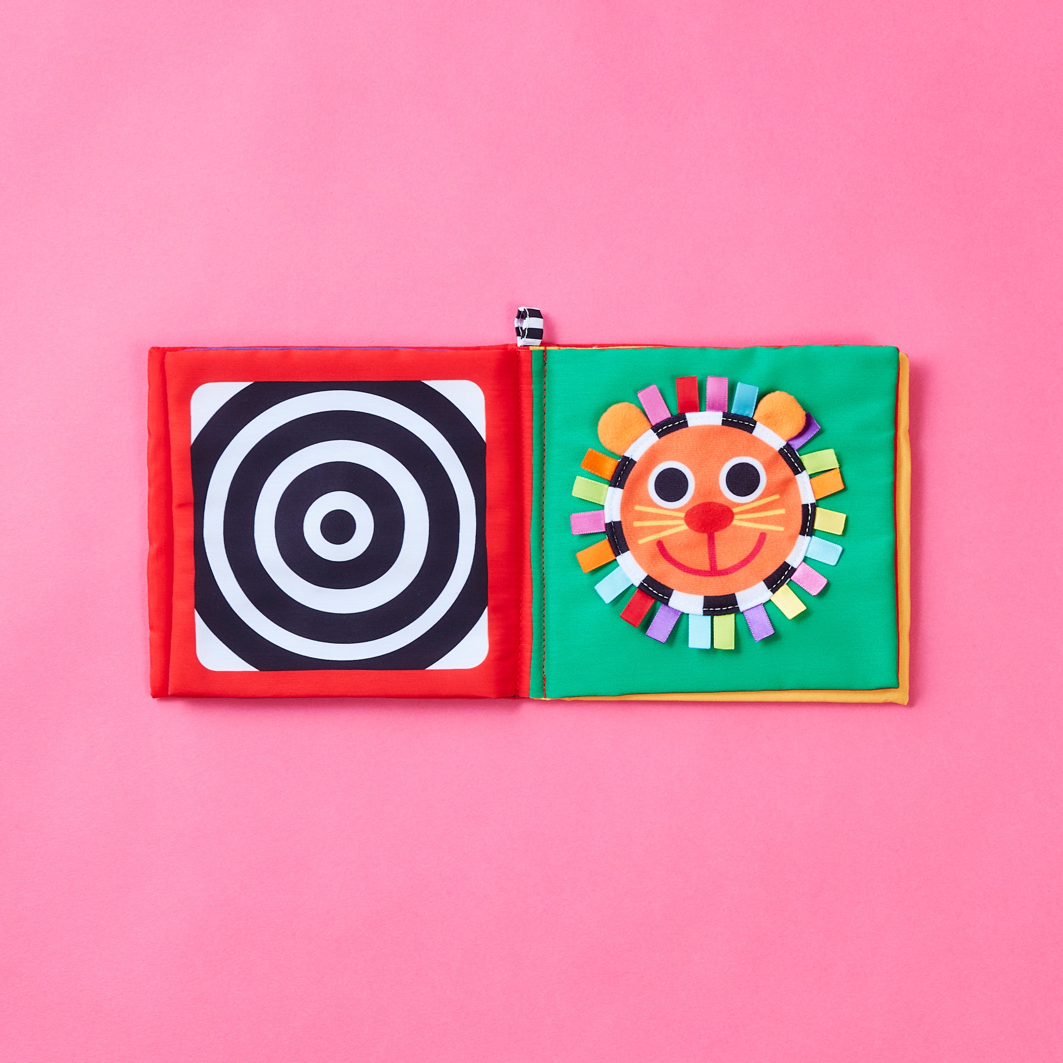 小さなお子さまにも認識しやすい白黒のぐるぐる、ドット、しましまのページの隣には、お馴染みのカラフルなキャラクターが次々登場。しまうまを押してキューキュー音を出したり、らいおんのリボンのたてがみを触ったり、葉っぱでいないいないばあを楽しんだりと、赤ちゃんの好奇心に出会える一冊です。うれしいストラップ付き。