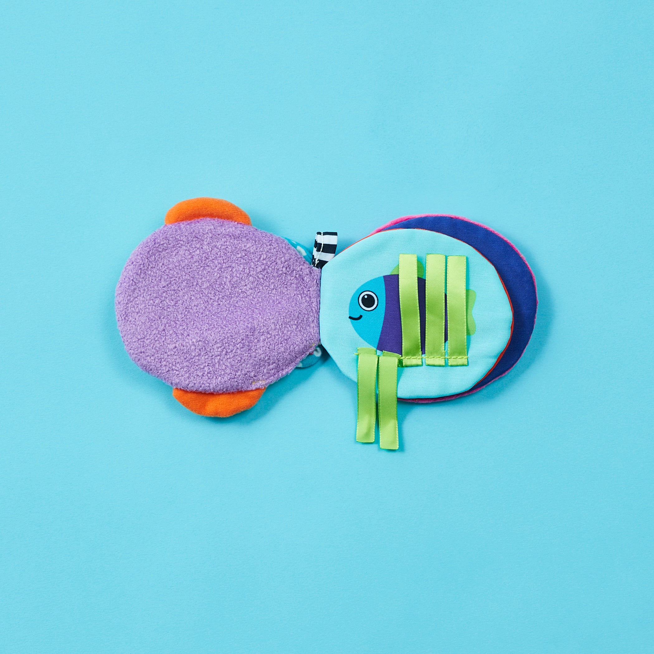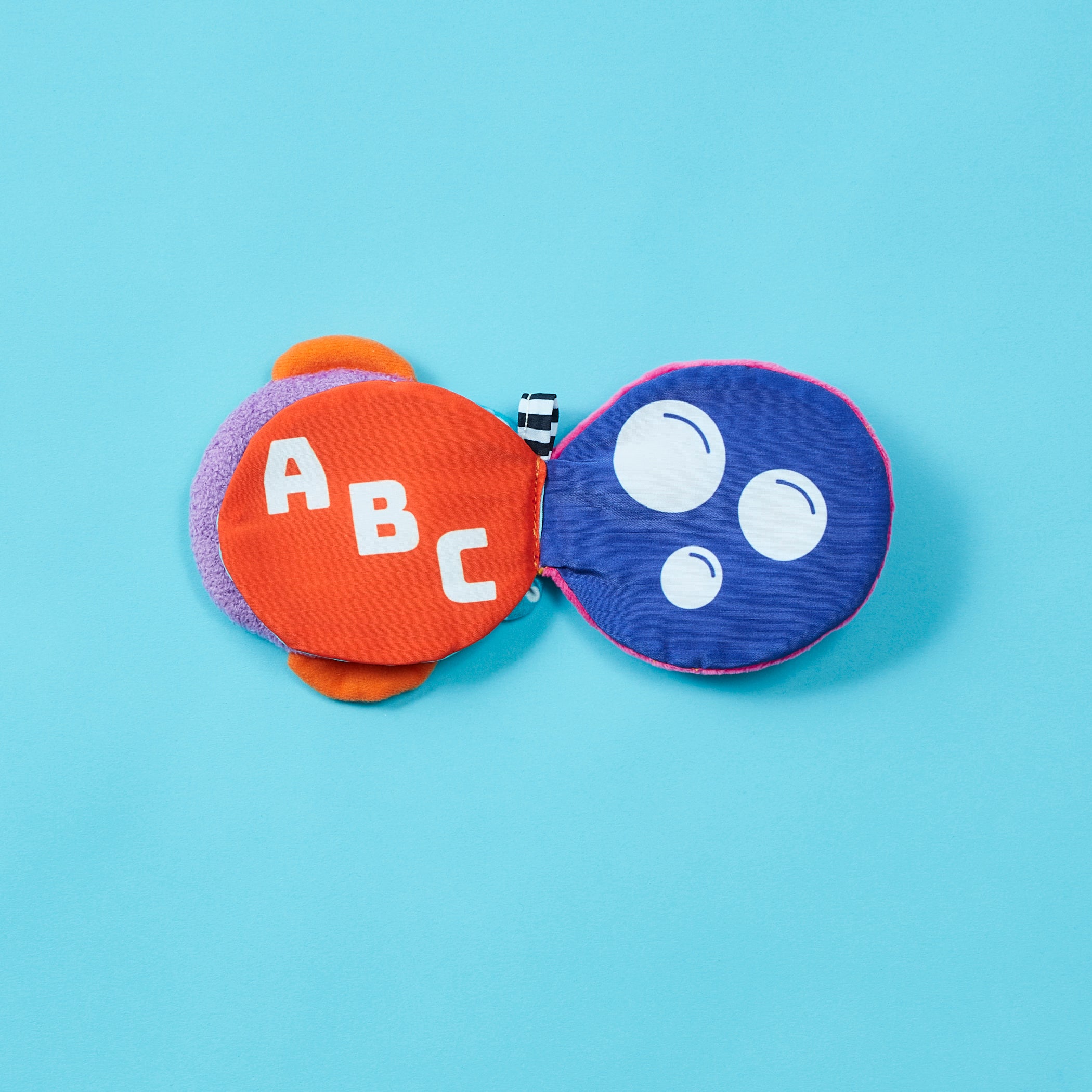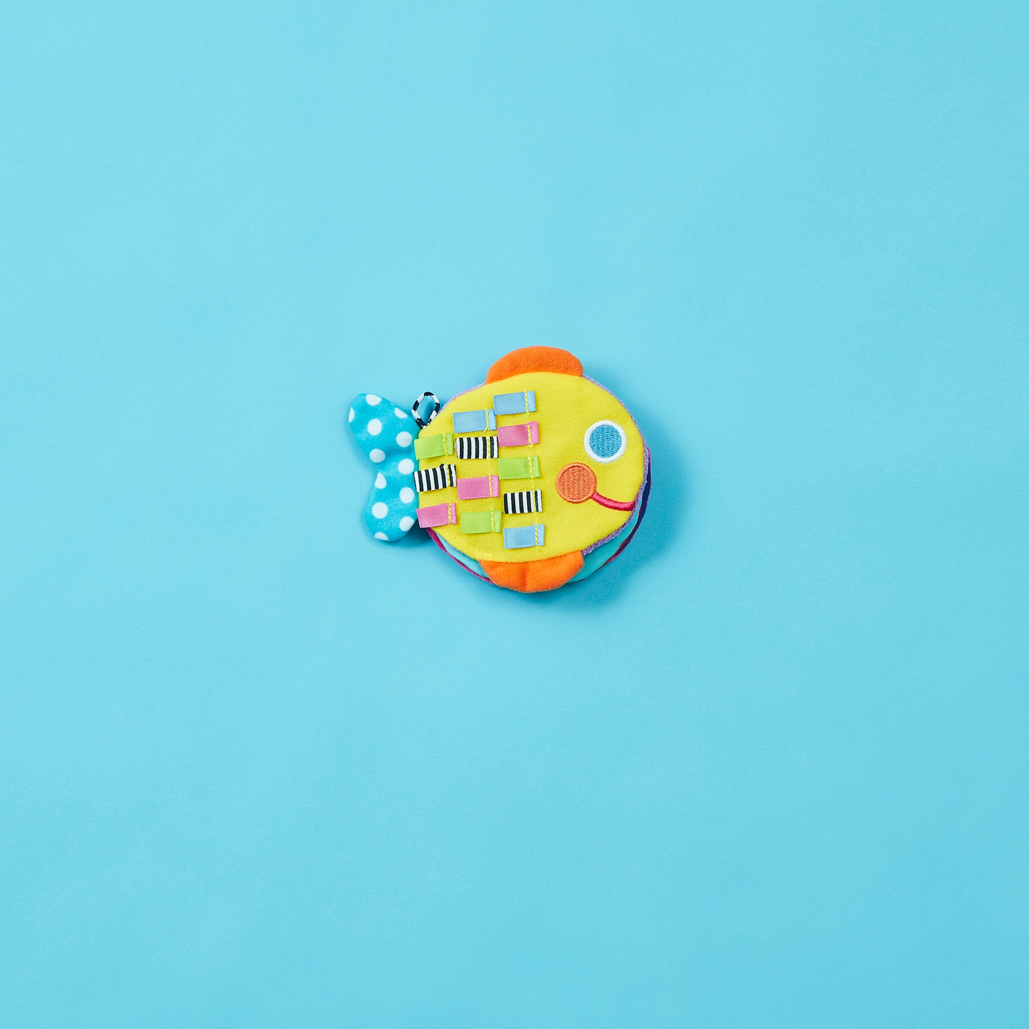 『Sassyのあかちゃんえほん ちゃぷちゃぷ』に登場するにっこり笑顔のおさかなのキャラクターがモチーフ。うろこや海藻に見立てて、お子さまの好きなつるつるの質感のリボンがたくさん使用されています。音や様々な触り心地を楽しみながら、海の中をテーマにお話を作って遊びましょう。お出かけ時に便利なループ付きです。