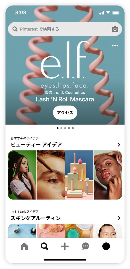 プレミア スポットライトは、ユーザーが Pinterest で新しいアイデアを発見する最初のステップである「検索ページ」などの画面に動画アドを配信します。この機能を利用した企業やブランドは、モバイルデバイスで表示された Pinterest 検索ページで約 50% の画面を確保して、新商品発売などの広告を行えます。