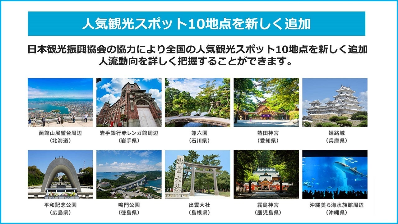 クロスロケーションズが加盟する日本観光振興協会の協力により全国の人気観光スポット10地点を新しく追加しました。全国の観光スポットの人流動向をより詳しく把握することができます。