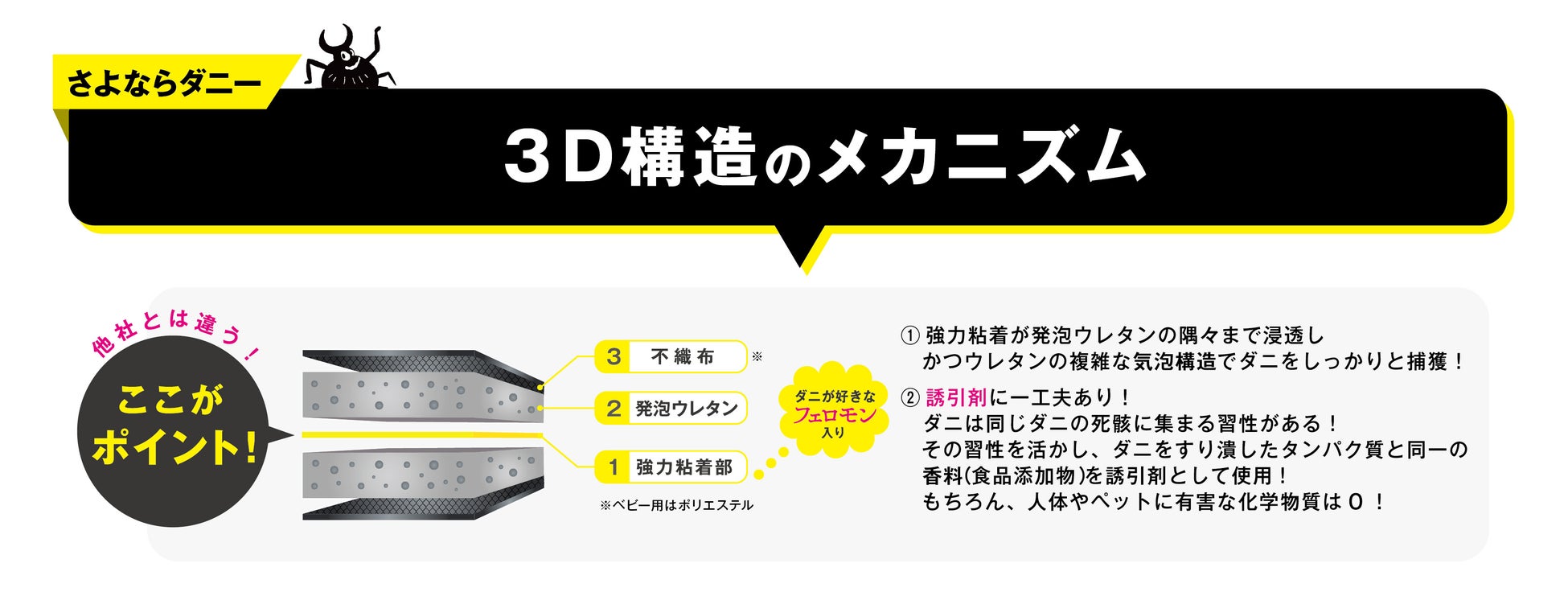 誘引剤には、仲間の死骸に集まるダニの習性を活かし、死骸と同一のニオイがする食品添加物の香料を使用。