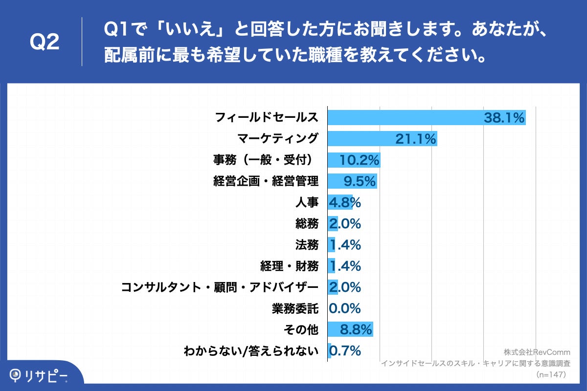 - インサイドセールス配属前に希望していた職種、約4割が「フィールドセールス」と回答