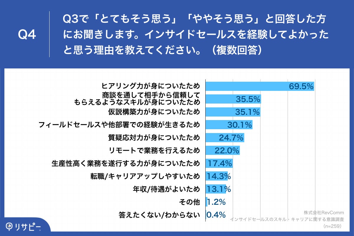 2年目以上のインサイドセールス、経験してよかった理由の最多は「ヒアリング力が身についた」69.5%