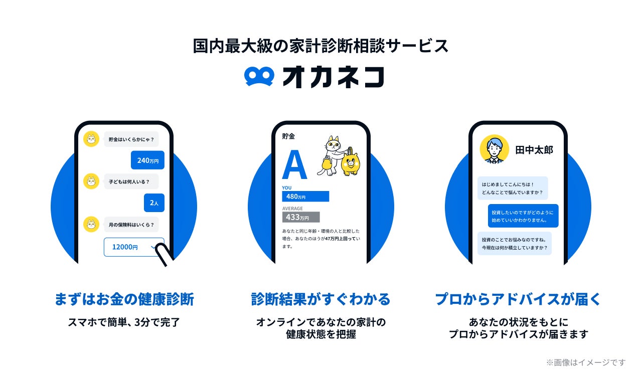 スマホから居住地や年齢、年収、家族構成などの質問に答えるだけで、同地域・同年代の人と比較し、ユーザーの家計状況を診断。その後、診断結果をもとにFP(ファイナンシャルプランナー)やIFA(金融商品仲介業者)等のお金に関する専門家からアドバイスコメントが届き、ユーザーはチャットで気軽に相談することができるオンラインサービスです。