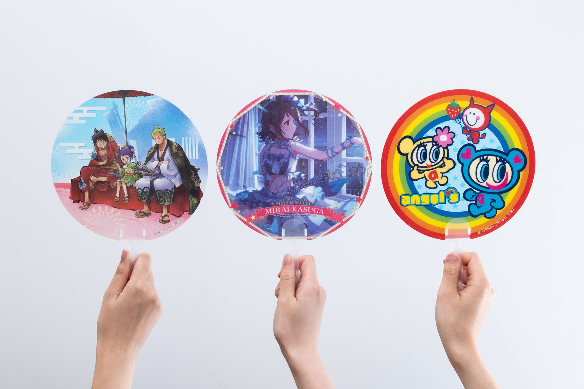 今回はガシャポン®史上初となるうちわアイテムが生活のあらゆるシーンで活躍できることを目指し、世代を問わず多くの方々から愛されている作品「ワンピース」や「アイドルマスター ミリオンライブ!」、平成元年にデビューし当時の小中学生から絶大な人気を博したファッションブランド「ANGEL BLUE」から、多数のデザインをそろえました。