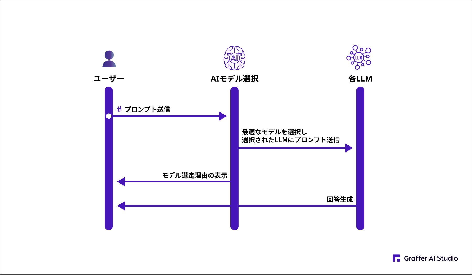 「モデル自動選択(ルーティング)」は、ユーザーの指示に応じて最適なLLMを自動で割り当てることで、上記3課題を同時に解消します。Graffer AI Studioの新機能は、この技術を実運用レベルで実装し、学習コストの削減、費用対効果の最大化、出力品質の安定化を実現します。