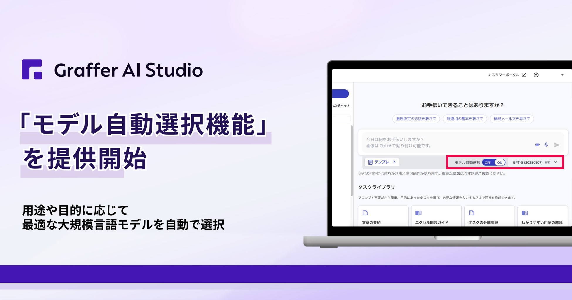 生成AI活用による企業変革を実現する株式会社グラファー(本社:東京都渋谷区、代表取締役:石井大地、以下「当社」)は、企業向け生成AI活用プラットフォーム「Graffer AI Studio」において、2025年10月30日(木)より新機能「モデル自動選択機能」の提供を開始します。本機能は、ユーザーが入力したプロンプト(指示)内容を解析し、用途や目的に応じて最適な大規模言語モデル(LLM)を自動で選定します。モデル選びの負担をなくし、誰でも簡単に使えるAI活用を実現します。
